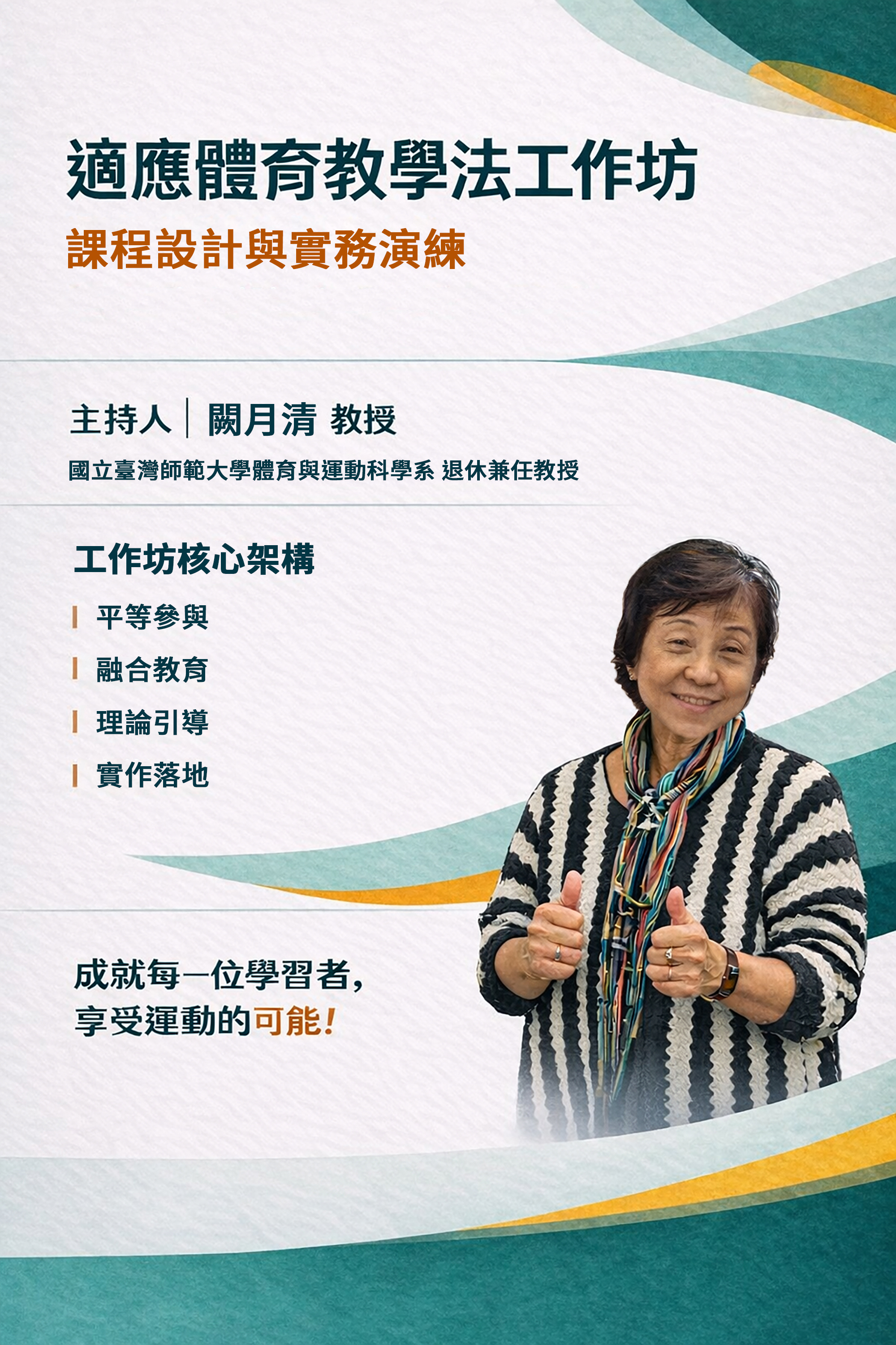(四)活動內容:本活動由講師結合相關理論模式,說明適應體育之課程設計與教學法,並透過實作引導學員將理論實際應 用於課程活動中。