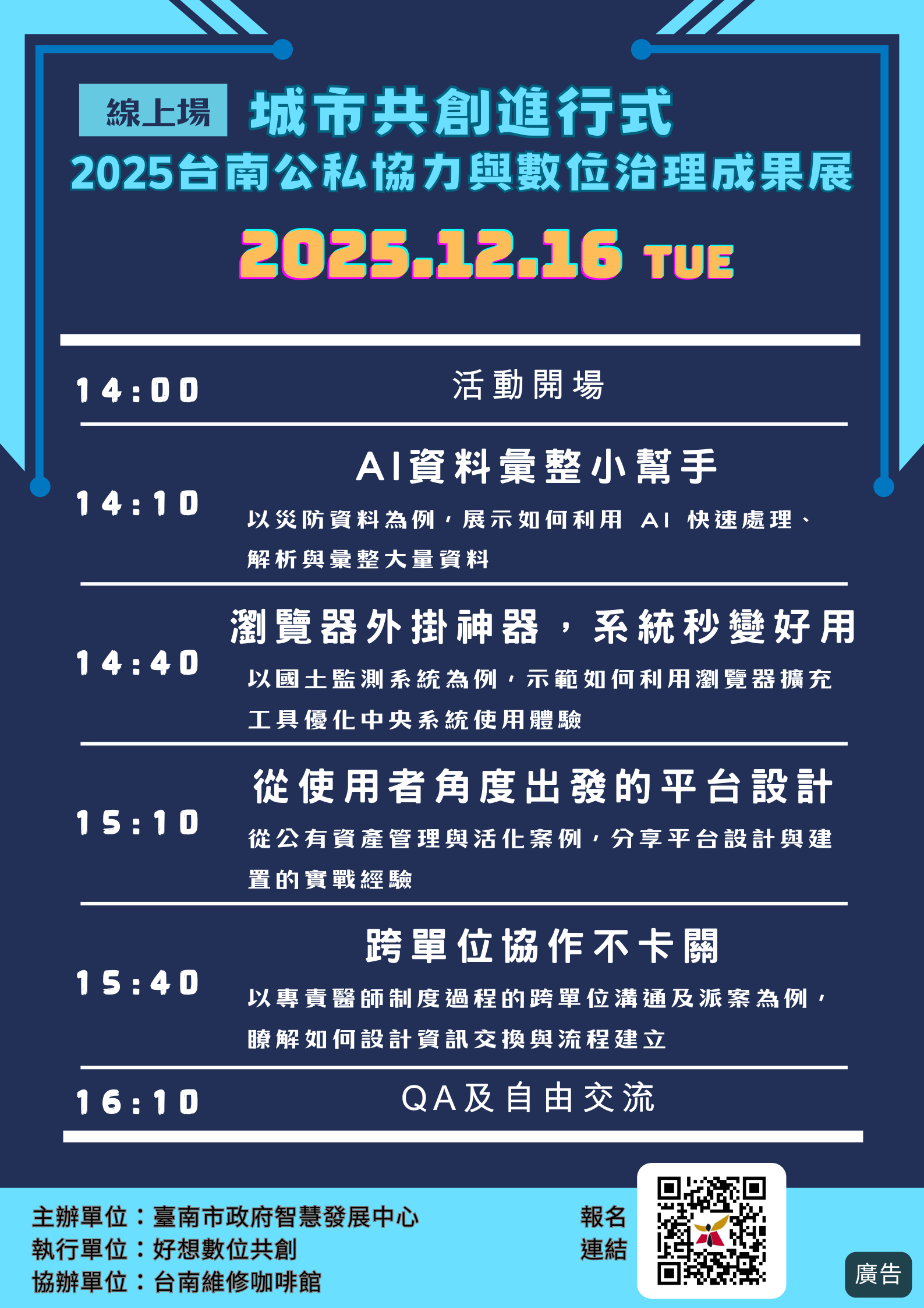 轉知「臺南市政府智慧發展中心辦理「城市共創進行式-2025台南公私協力與數位治理分享會(線上場)」活動」訊息。