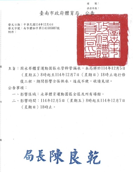 本局永華體育運動園區水管修復工程12月5日(星期五)8時起至12月7日(星期日)18時止進行整修,期間影響全區供水,造成不便,敬請見諒。