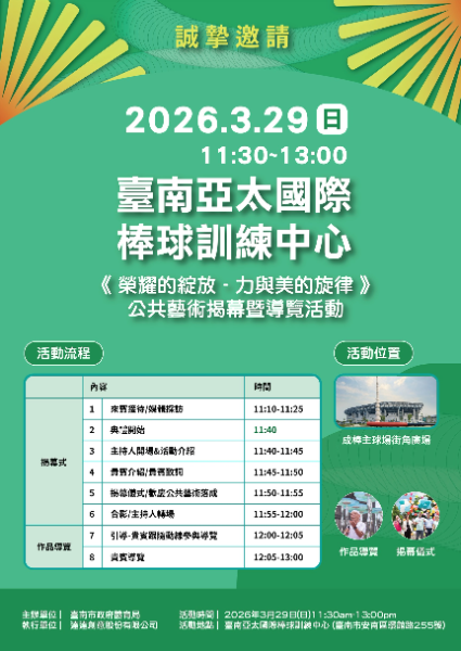1.活動日期:115年3月29日(星期日)。 2.活動時間:上午11時30分至下午1時(報到時間:上午11時10分至11時30分)。 3.活動地點:臺南亞太國際棒球訓練中心(成棒主球場街角廣場球塔區)。 4.活動地址:臺南市安南區環館路255號。 5.報名網址:https://reurl.cc/gr0qNQ。